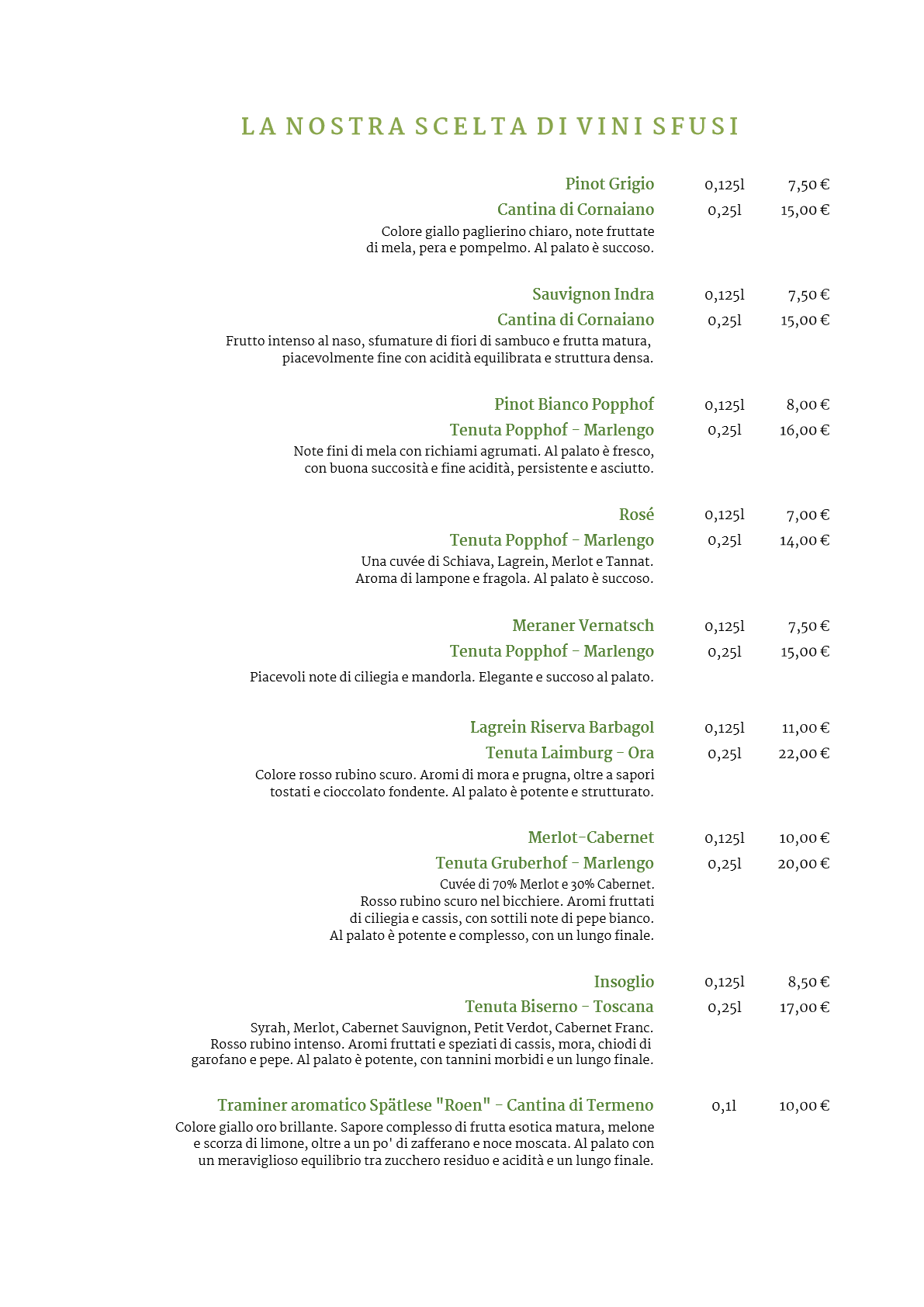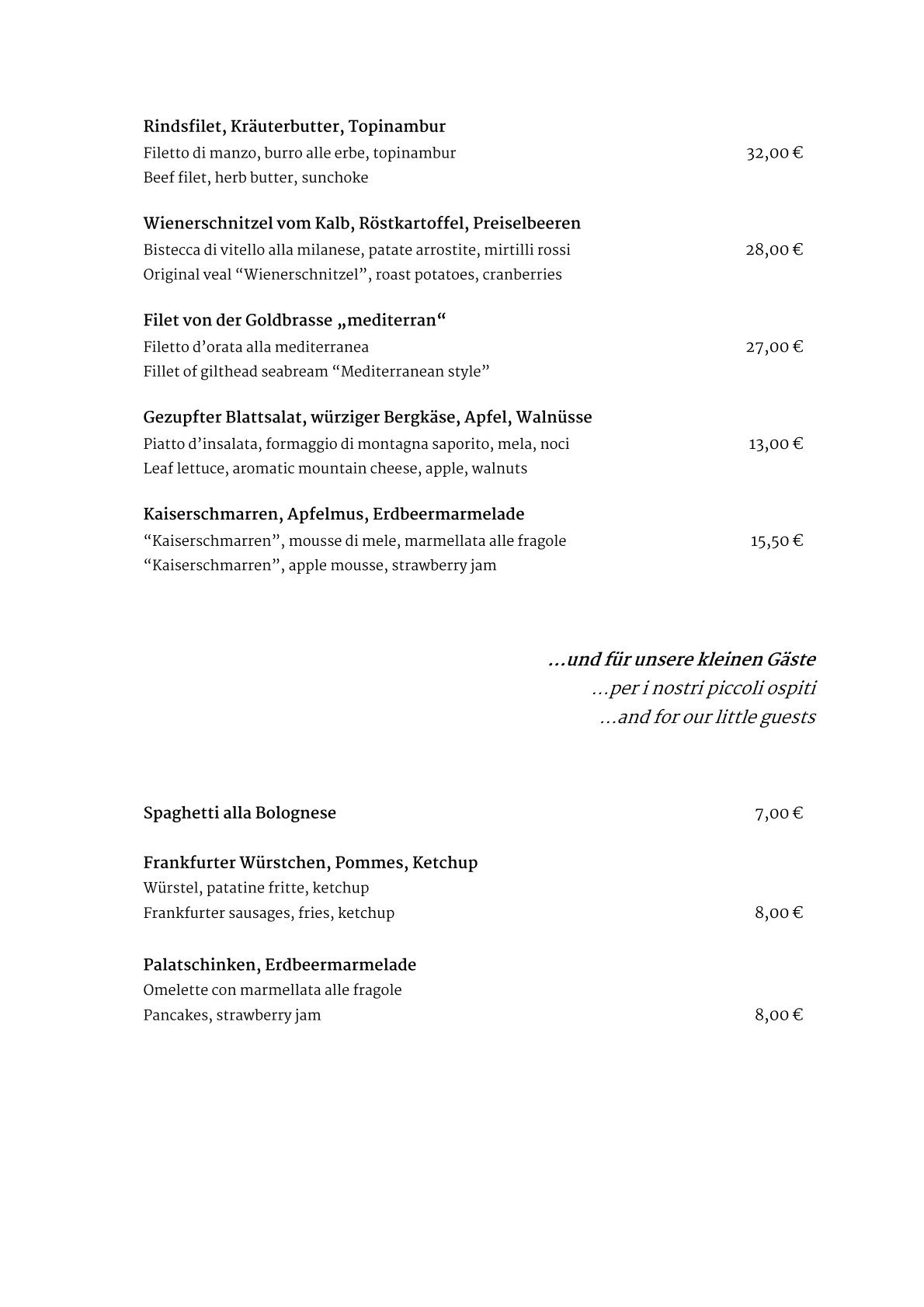 Una giornata di vacanza ricca di eventi inizia con una buona e sana colazione. Con noi potete davvero concedervi ogni mattina e iniziare il nuovo giorno in modo sano e in forma. Dal salato al dolce: ce n’è per tutti i gusti! Vengono serviti prodotti di alta qualità provenienti dalla regione. Provate le marmellate e il miele fatti in casa, lo yogurt locale, le torte fatte in casa, i panini croccanti e la frutta fresca del nostro giardino. Sono disponibili anche specialità salate come salsicce e formaggi della regione e deliziosi piatti a base di uova. Ordinate succhi di frutta rinfrescanti, tè a base di frutta ed erbe raccolte a mano in Alto Adige o un buon caffè direttamente al tavolo. Siamo felici di viziare i nostri piccoli ospiti con un latte caldo o una cioccolata calda. Il luogo migliore per gustare la colazione è la nostra terrazza panoramica nelle belle giornate o la nostra accogliente sala colazione quando le temperature sono più basse. Su richiesta, saremo lieti di servirvi un’ottima colazione davanti al vostro appartamento. Non c’è modo migliore per iniziare la vostra vacanza!