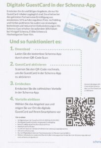 Entdecken Sie die vielfältigen Angebote, die nur für die GuestCard-Inhaber zugänglich sind. Sie erhalten bei den gelisteten Partnern eine Ermäßigung von mindestens 10% auf den regulären Preis. Im Frühling und Herbst profitieren Sie zudem von einmaligen kostenlosen und reduzierten Exklusivleistungen!