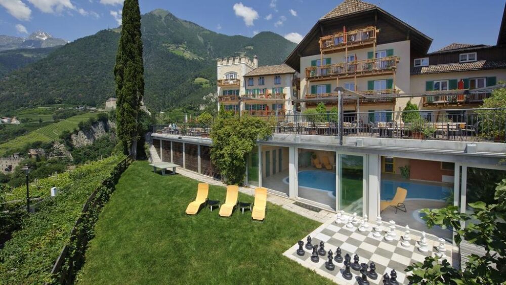 Der Garten mit Liegewiese, großem Gartenschach und Zugang zum Hallenbad, die Weinreben ringsum und der Blick auf Schloss Tirol, die Brunnenburg, das Etschtal und den Naturpark Texelgruppe machen unser Hundehotel in Südtirol zu einem aussichtsreichen und einladenden Urlaubszuhause. Hier können sich Hund und Mensch entspannen, gemeinsam intensive Stunden auf der Hundewiese oder beim Hundetraining verbringen – eben einen pfotigen Urlaub mit Hund in Südtirol.