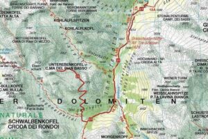 Höchste Wegstelle: Forcella Misurina, 2395mGesamtgehzeitca. 4,5Stunden (Rif. Col de Varda bis Rif. Fonda Savio 2½ -3Stunden, Rif. Fonda Savio –Misurinasee 1 ½ Stunden)