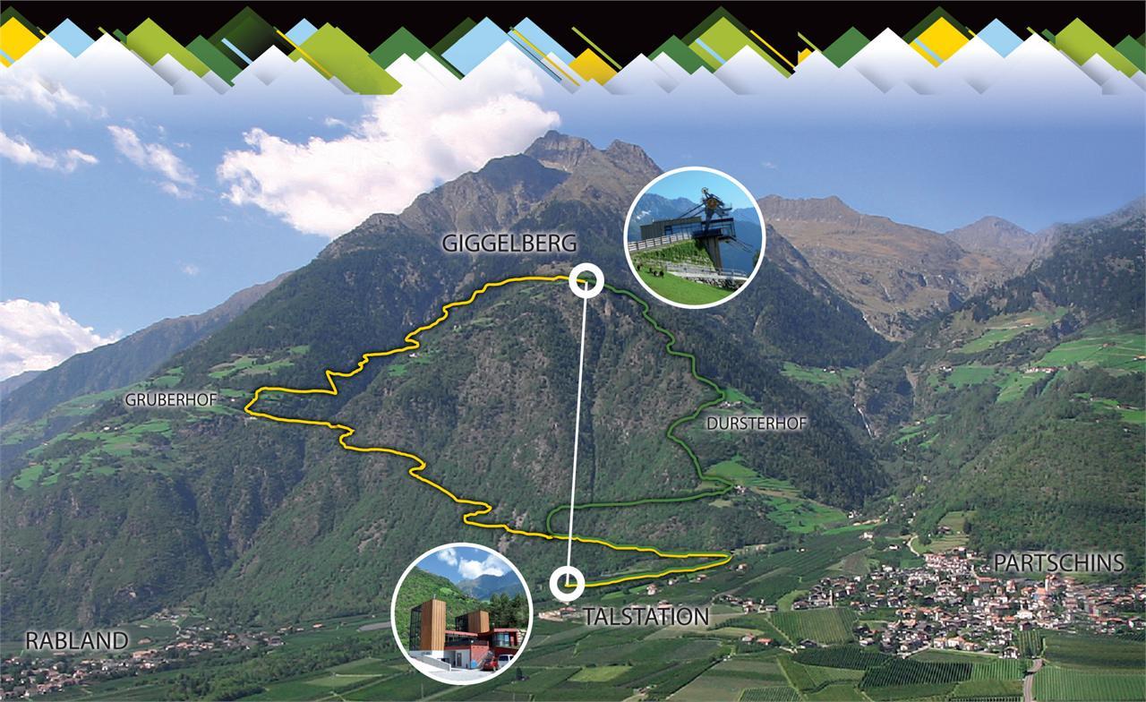 Start/Talstation Texelbahn – der gelb und grün gekennzeichneten Beschilderung folgend – Abzweigung links – nur mehr der gelb gekennzeichneten Bechilderung folgend – über den Gruberhof (Gasthaus geschlossen) – bis zur Bergstation Texelbahn.Aufstieg932 m