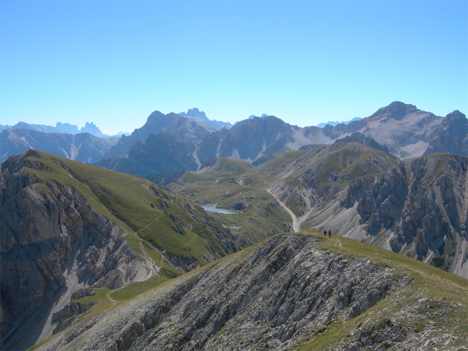 Weiter geht es auf der Wegmarkierung 12 über Felsen, an deren Vorsprüngen man sich etwas festhalten muss, und über einige Stufen, bevor man das Gipfelkreuz zu sehen bekommt.Auf dem Gipfel erwartet einen ein unglaublicher Rundblick auf die Berge von Fanes-Sennes-Prags, Zillertaler Alpen und Tauern.
