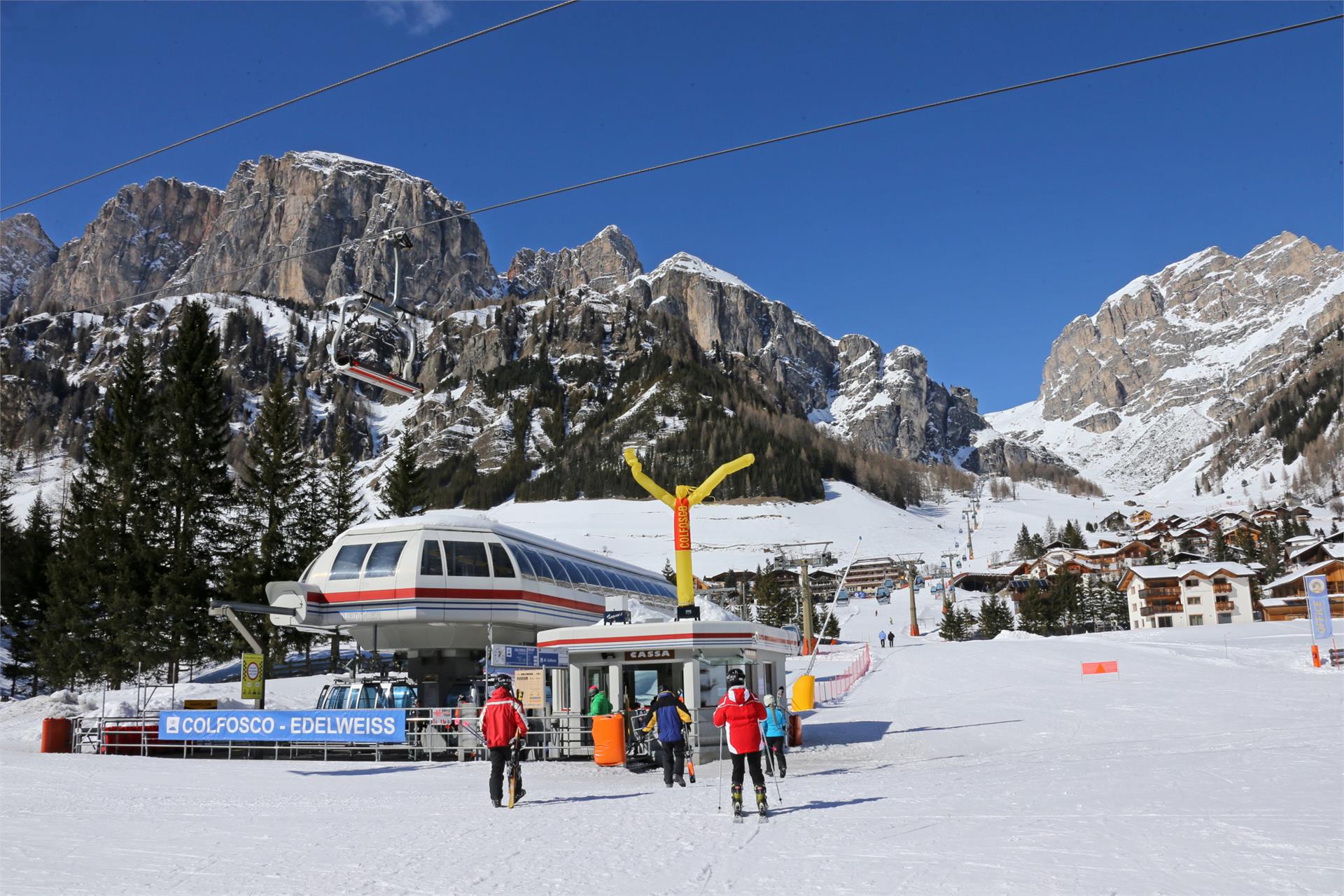 Die 8-Sitzer-Gondelbahn, die im sonnigen Edelweiß Tal in Colfosco abfährt, bedient mehrere Pisten, von diesen sind etliche für Anfänger besonders geeignet.