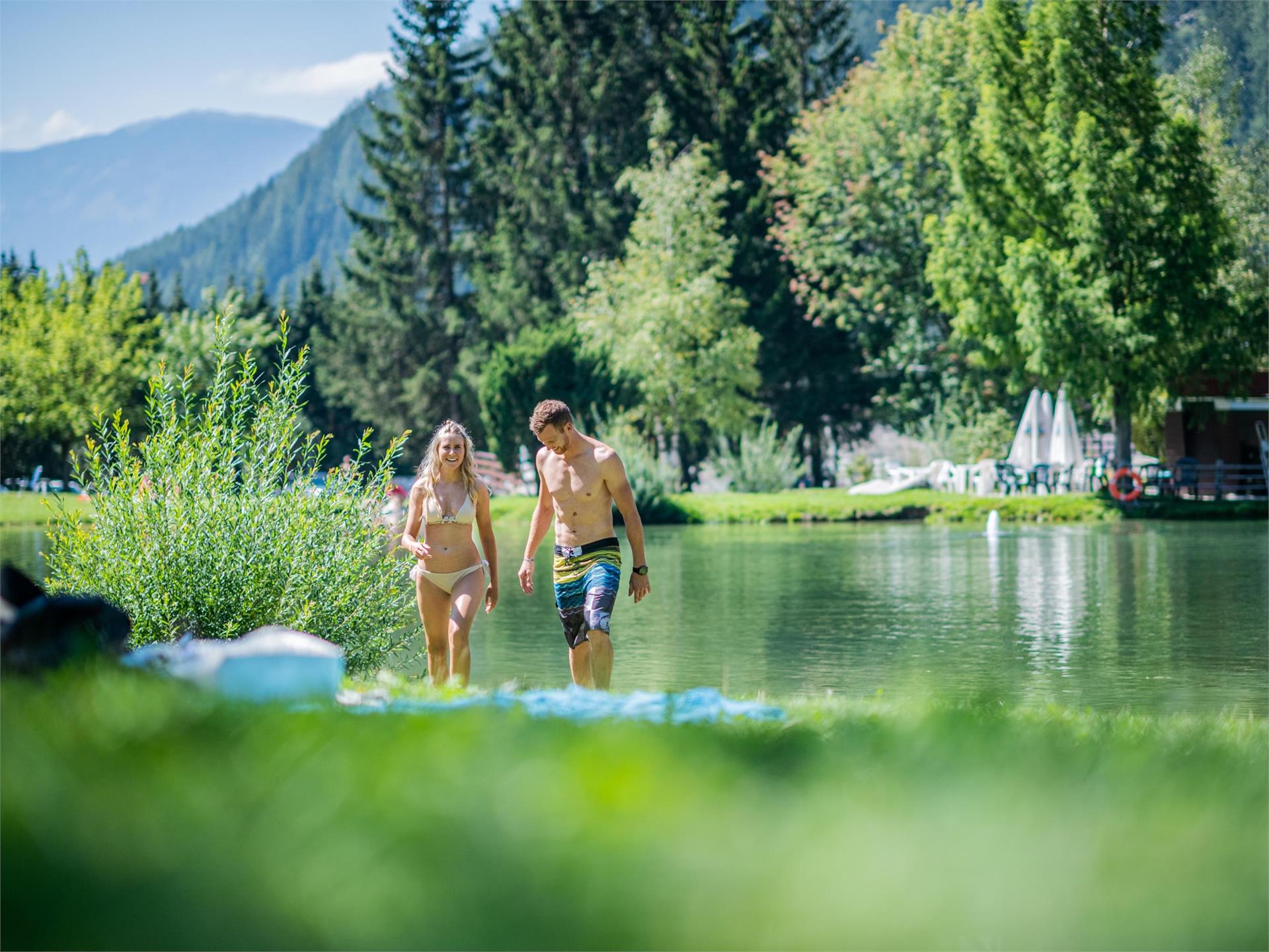 Schöner Badesee für Groß und Klein in Gais in der Nähe des Radweges mit Liegewiese und Bar.