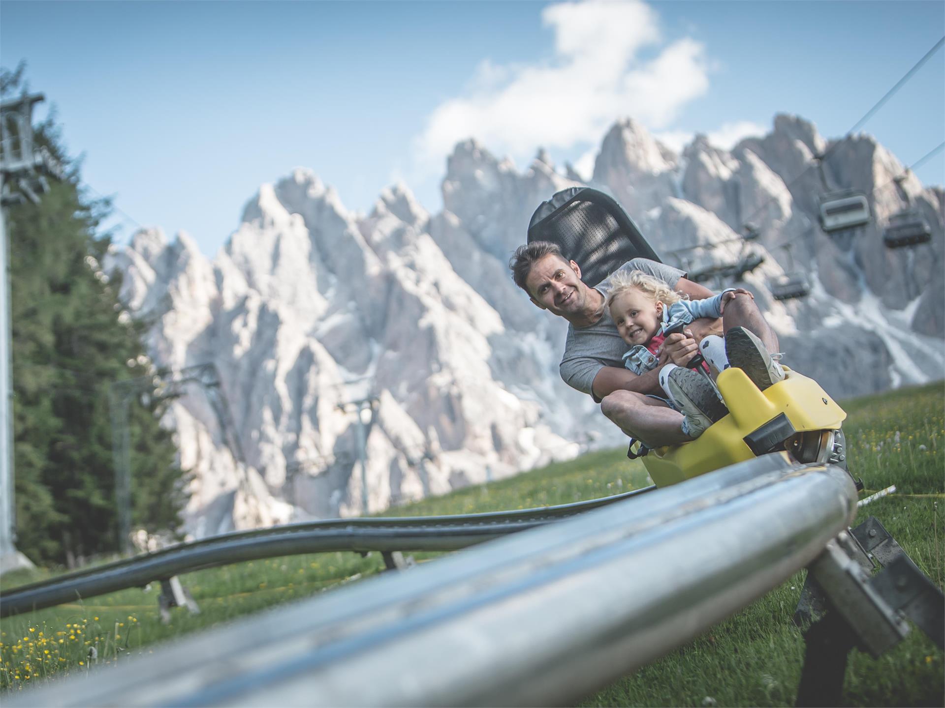 Die 1. Sommerrodelbahn Italiens. Die Bobs sind sicher auf einem 1.750 m langen Aluminiumrohr montiert. Brausen Sie bis ins Tal und haben Sie mindestens gleich viel Spaß wie die Kinder, denn für Erwachsene ist eine Fahrt mit dem Fun-Bob ein Erlebnis der besonderen Art, kann man doch die Geschwindigkeit selbst regulieren.