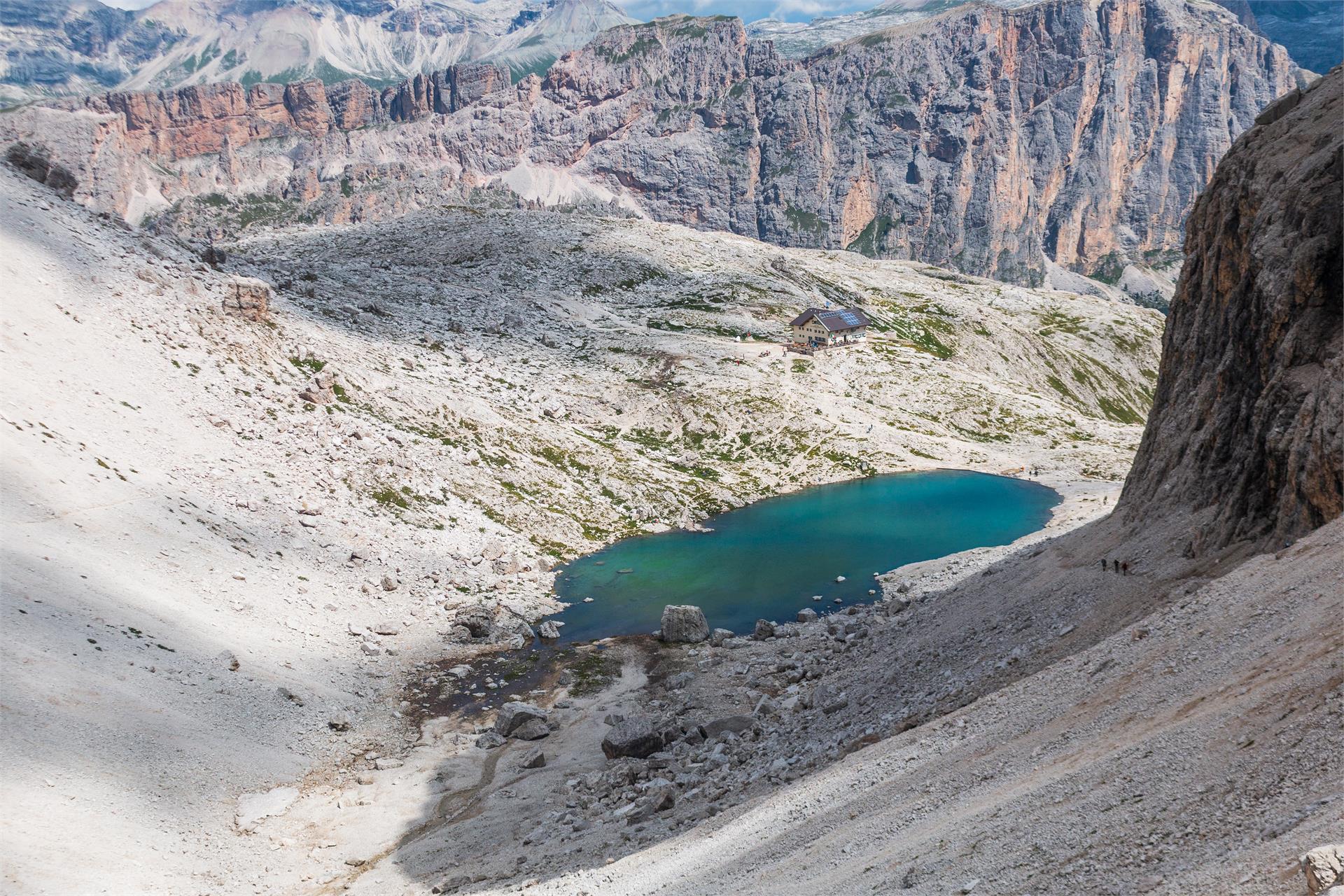 Dal Passo Gardena, imboccando il sentiero nr. 666 si sale in direzione sud-est lungo la cresta erbosa che porta verso le pareti rocciose del Grup dl Sela. Si continua, dapprima in pianura, poi in leggera discesa, fino all’ imbocco della Val Setus. Si sale per il ripido ghiaione lungo una visibile serpentina, fino alla biforcazione del canalone. Si prosegue quindi a sinistra (corde metalliche fisse), raggiungendo in breve la grande cengia, che attraversa tutto il massiccio del Sella. Mantenedo la sinistra, si raggiunge in pochi minuti il rifugio Pisciadú (2h 10min.). A pochi passi dal rifugio si può ammirare il Lech de Pisciadù. La discesa porta prima verso est (sentiero nr. 676), oltre la grande terrazza, poi per il fianco roccioso a balze della Val dei Bosli (corde metalliche fisse), giungendo alla Val Mezdì. Si percorre il primo tratto ghiaioso, dopodichè si abbandona la stretta valle imboccando il sentiero nr. 651. Qui si apre un vasto panorama sui verdi prati di fondovalle, che contrastano con il colore chiaro delle pareti rocciose. Si scende costeggiando il torrente, fino alla piana coperta di larici, poi attraverso i prati, seguendo il sentiero nr. 650 che arriva a Colfosco.