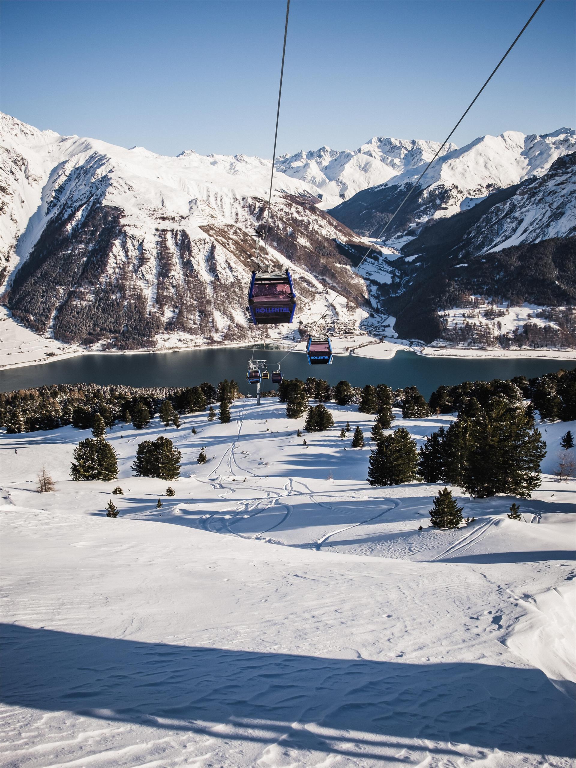 Top Abfahrt mit einmaligem Ausblick auf den Reschensee, dem historischem Grauner Turm und dem Langtauferer Tal.