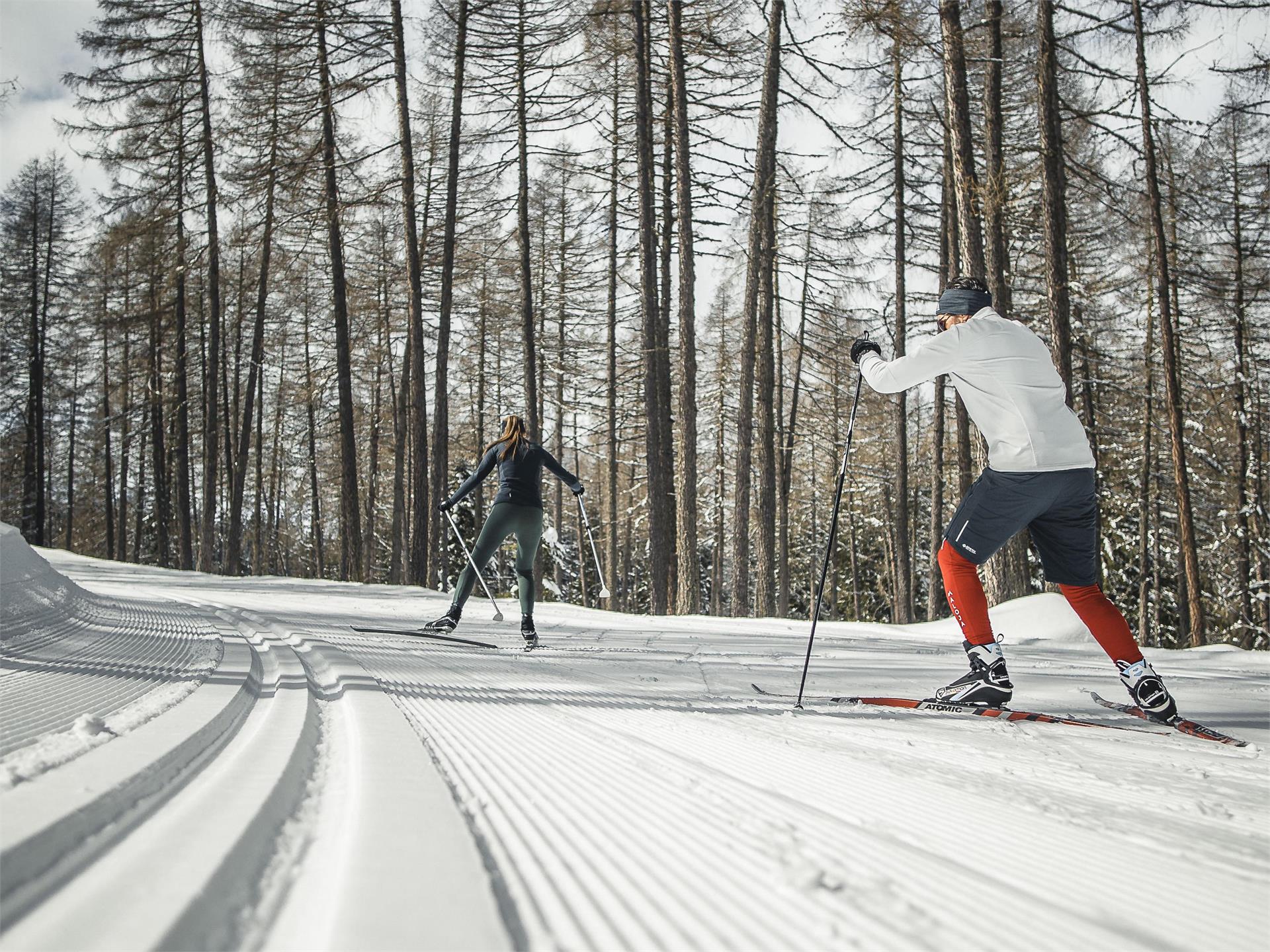 Die Loipe beginnt unterhalb der Talstation der Umlaufbahn in Hafling/Falzeben und führt über 3 km durch den verschneiten Winterwald der Hochebene.