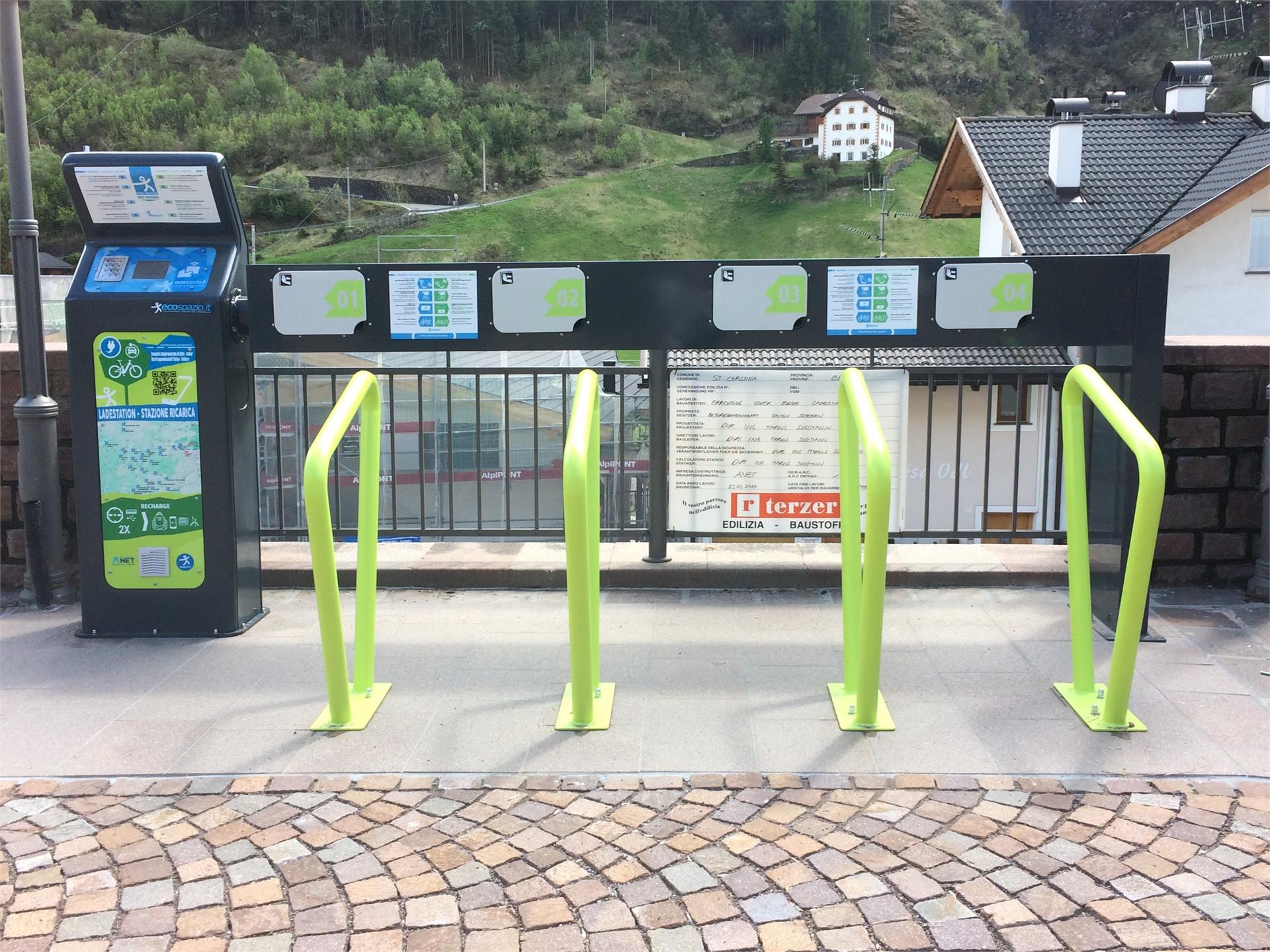E-bike Ladestation zum Aufladen Ihres Elektrofahrrades. Mit einer kontaktless Karte (Bancomat, Kreditkarte, Südtirol Pass, usw.) kann der kostenlose Dienst in Anspruch genommen werden. Der eigene Lagekabel muss mitgebracht werden.
