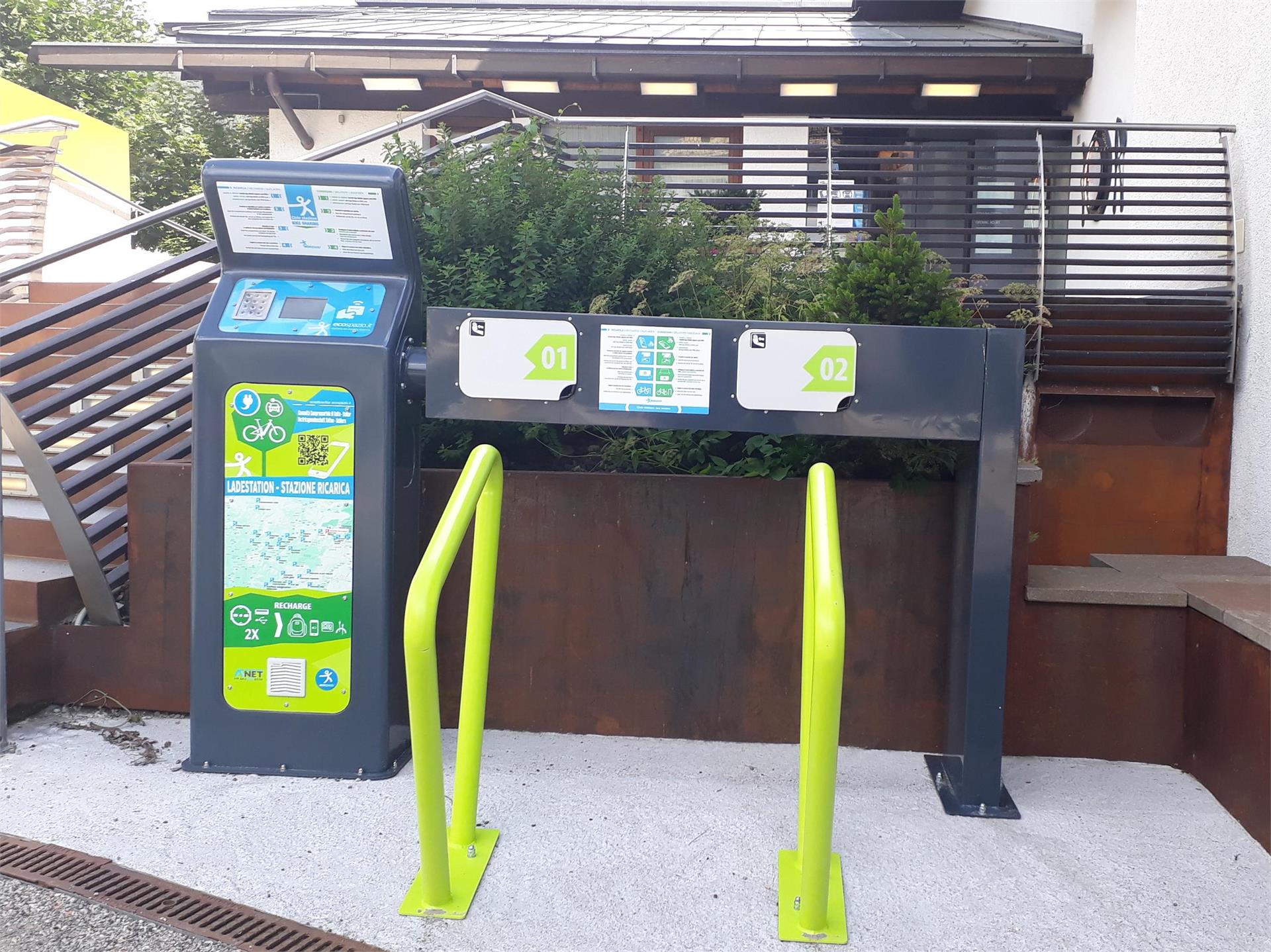 E-bike Ladestation zum Aufladen Ihres Elektrofahrrades. Mit einer kontaktless Karte (Bancomat, Kreditkarte, Südtirol Pass, usw.) kann der kostenlose Dienst in Anspruch genommen werden. Der eigene Lagekabel muss mitgebracht werden.