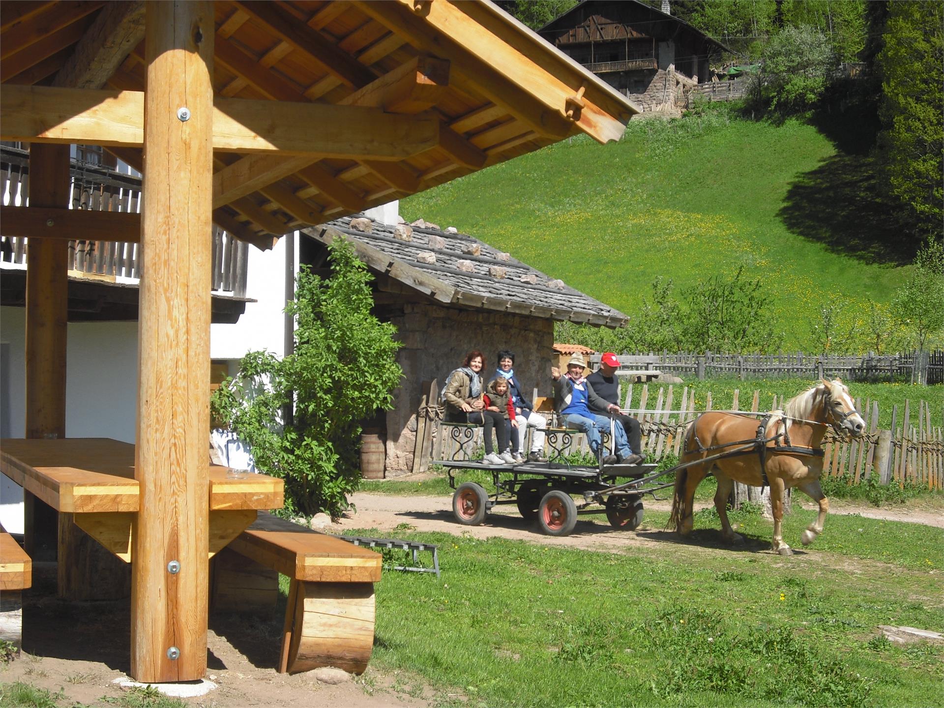 Der Hofschrank Bacherhof bietet neben einem Streichelzoo Ausritte, Ponyreiten für Kinder und auch traditionelle Südtiroler Bauernkost.