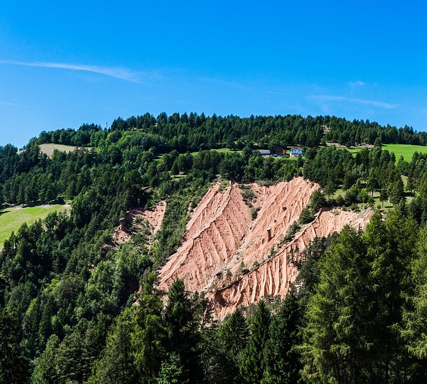 Geologische Formationen der letzten Eiszeit Klar hebt sich der rote Lehmboden des großen Erdrutschgebietes von den Weiden und Wäldern ab und deutlich treten die Erdpyramiden hervor. Die Lahn ist Ursprungsgebiet des Margarethenbaches, der hinunter ins Etschtal nach Siebeneich flie...