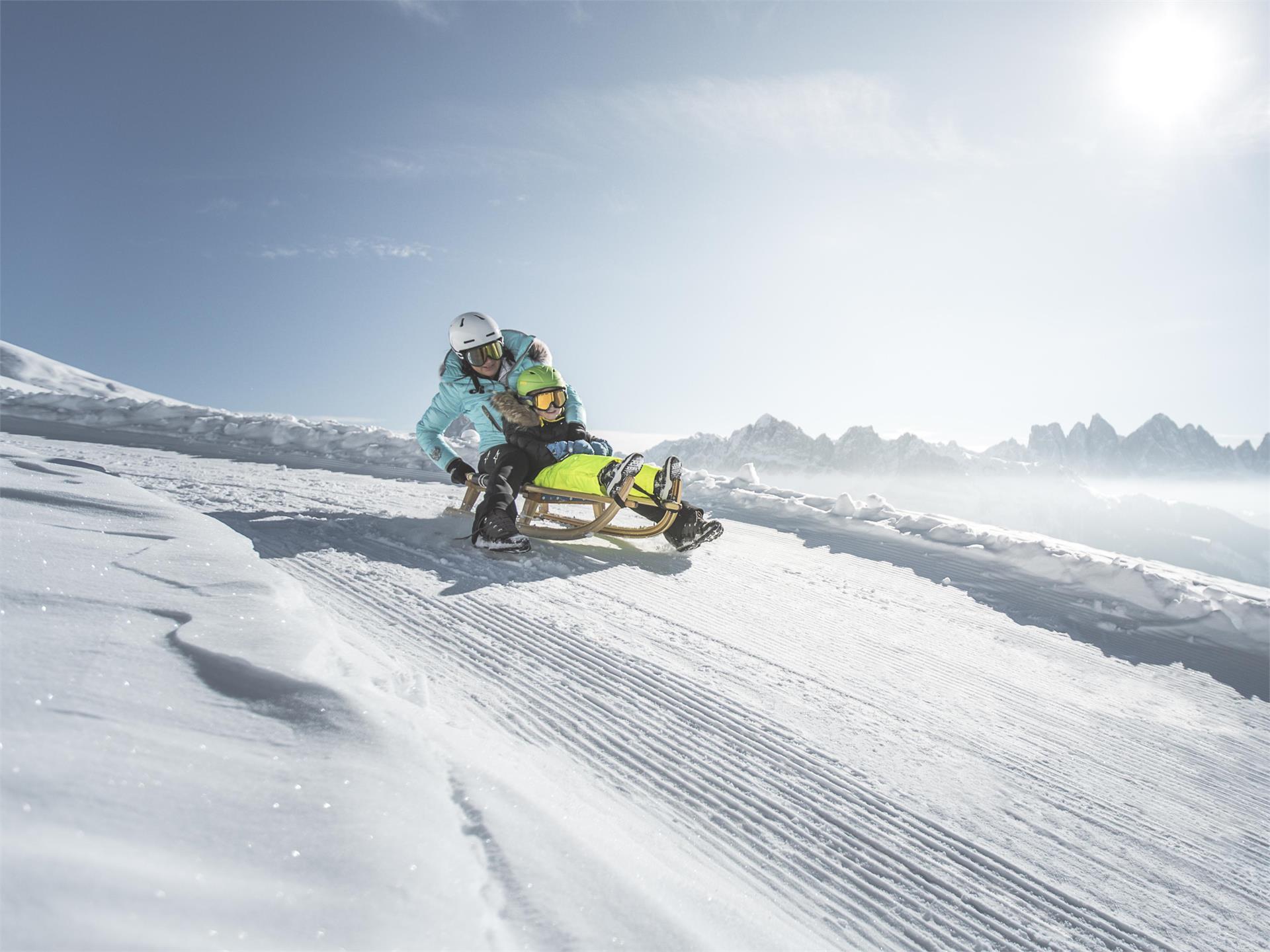 Familien mit kleinen Kindern und ganz Gemütliche werden auf dem Rodelweg Rossalm-Kreuztal all das vorfinden, was sie erwarten: ein breiter Rodelweg führt mit geringem Anstieg zu einer einladenden Hütte. Der Weg ist ca. 2,5 km lang und verläuft in sonnigem Gelände mit imposanten Ausblick auf die Dolomiten. Gehzeit: ca. 45 Min.
