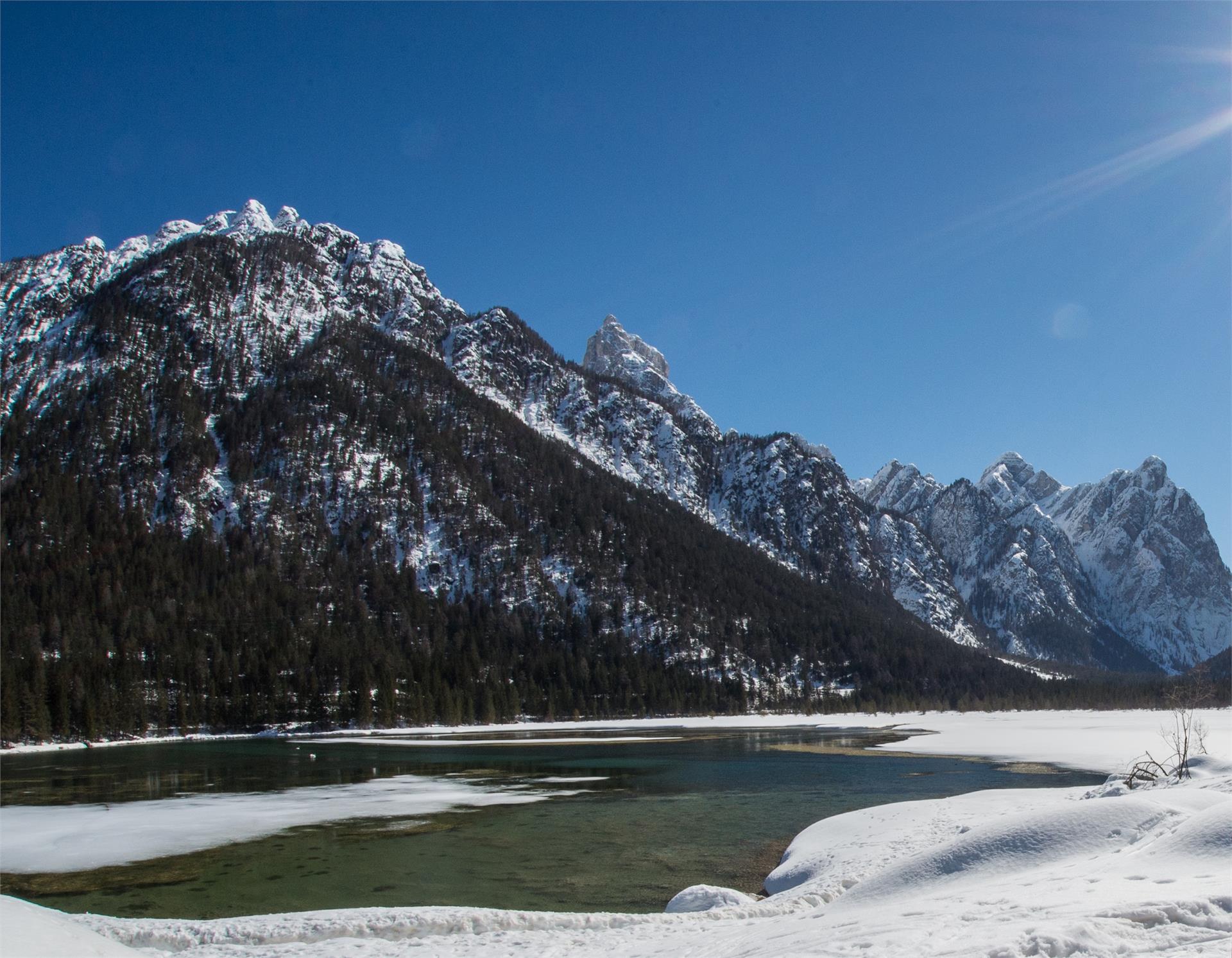 Die Schneeschuhwanderung startet bei den Säghäusern in der Rienz. Der Weg Nr. 16A, führt inmitten im Wald hoch bis zur Trogeralm (unbewirtet) mit wunderschönen Blick auf den Toblacher See. Von dort geht die Wanderung weiter auf den Wegn Nr. 16 bis zum Suisriedl.