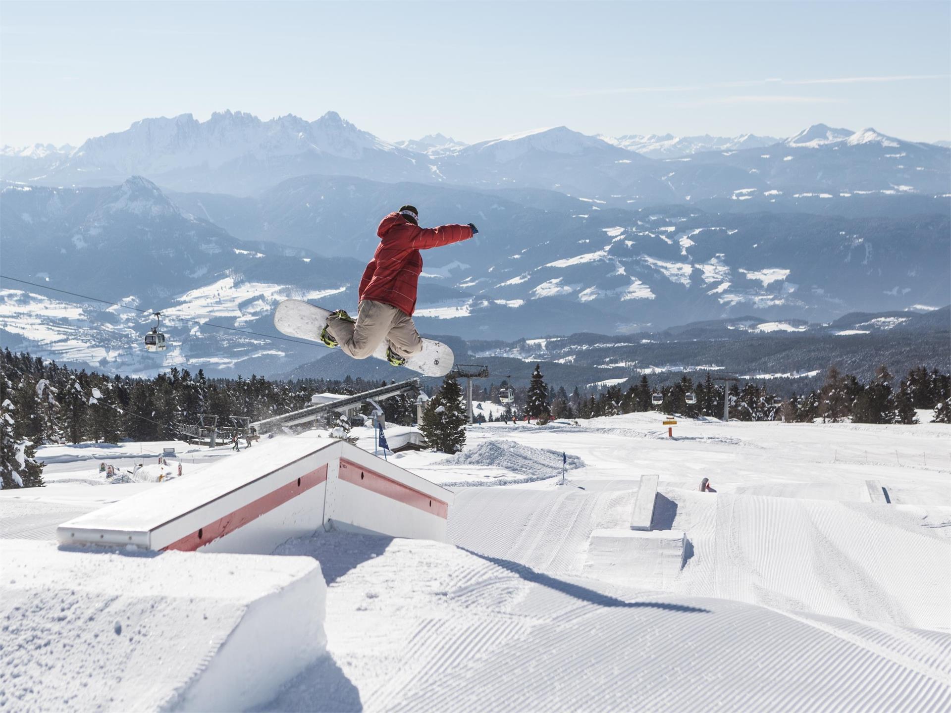 Ritten-Style, Snowboardvergnügen im kleinen aber feinen Skigebiet Rittner Horn auf gepflegten und breiten Pisten. Der Snowpark Rittner Horn liegt zwischen der Schwarzseespitze und der Mittelstation: Freestyler können hier um die Wette springen.