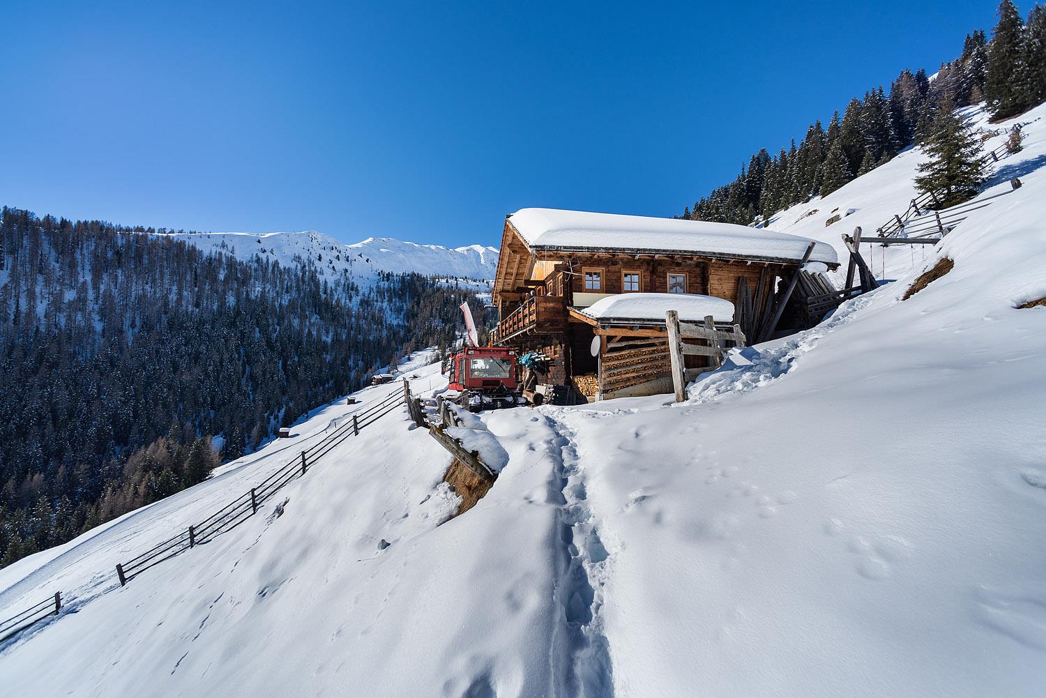 Vom Talschluss in St. Magdalena/Gsieser Tal 1465m wandert man querfeldein, ständig am Rande der Skipiste hinauf, an den wunderschönen „Hacklerhöfen vorbei, bis wir im Weiler „Ampfertal“ auf den Almweg stoßen. Hier trifft man bereits auf das Hinweisschild „Ascht“ mit der „Nr. 10“. Nach ca. 1 Stunde und 15 Minuten erreicht man bereits unser erstes Ziel, die Aschtalm auf 1950m (Einkehrmöglichkeit). Von dort ein wunderbarer Ausblick auf nicht weniger als 16 Almgebäude. Ein tolles Angebot für Rodelfahrer: wem die Abfahrt von hier aus zu kurz sein sollte, kann seinen Schlitten noch ca. 200 Höhenmeter zu den Pfinnhütten 2152m hochziehen, um von dort aus nach St. Magdalena hinunterzufahren.