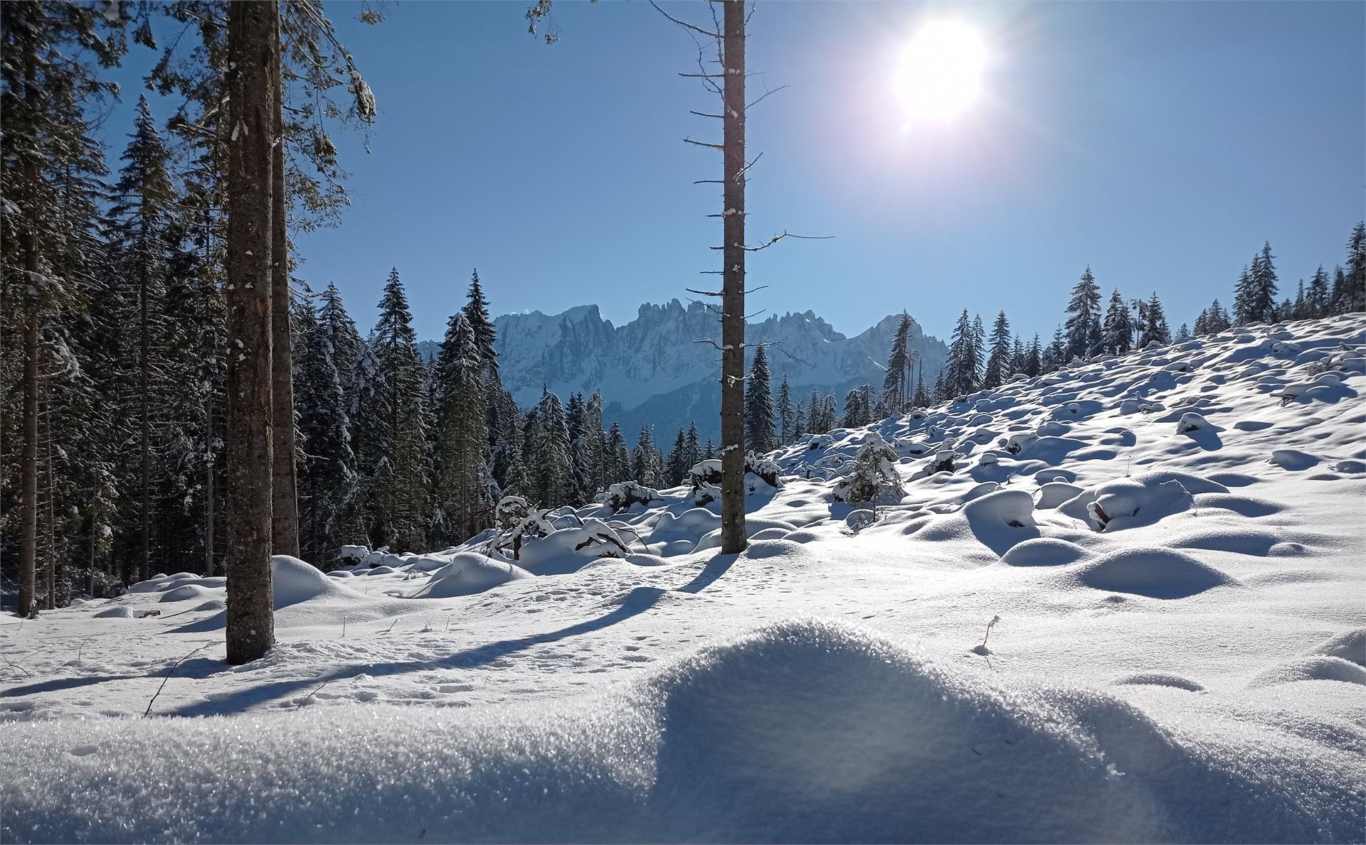 Gemütliche Winterwanderung für Familien über die Forststraße von Obergummer (Landgasthof Lärchenwald) zur Jausenstation Schillerhof, von wo aus man einen schönen Ausblick auf Rosengarten und Latemar genießen kann.  Rückweg wie Hinweg.