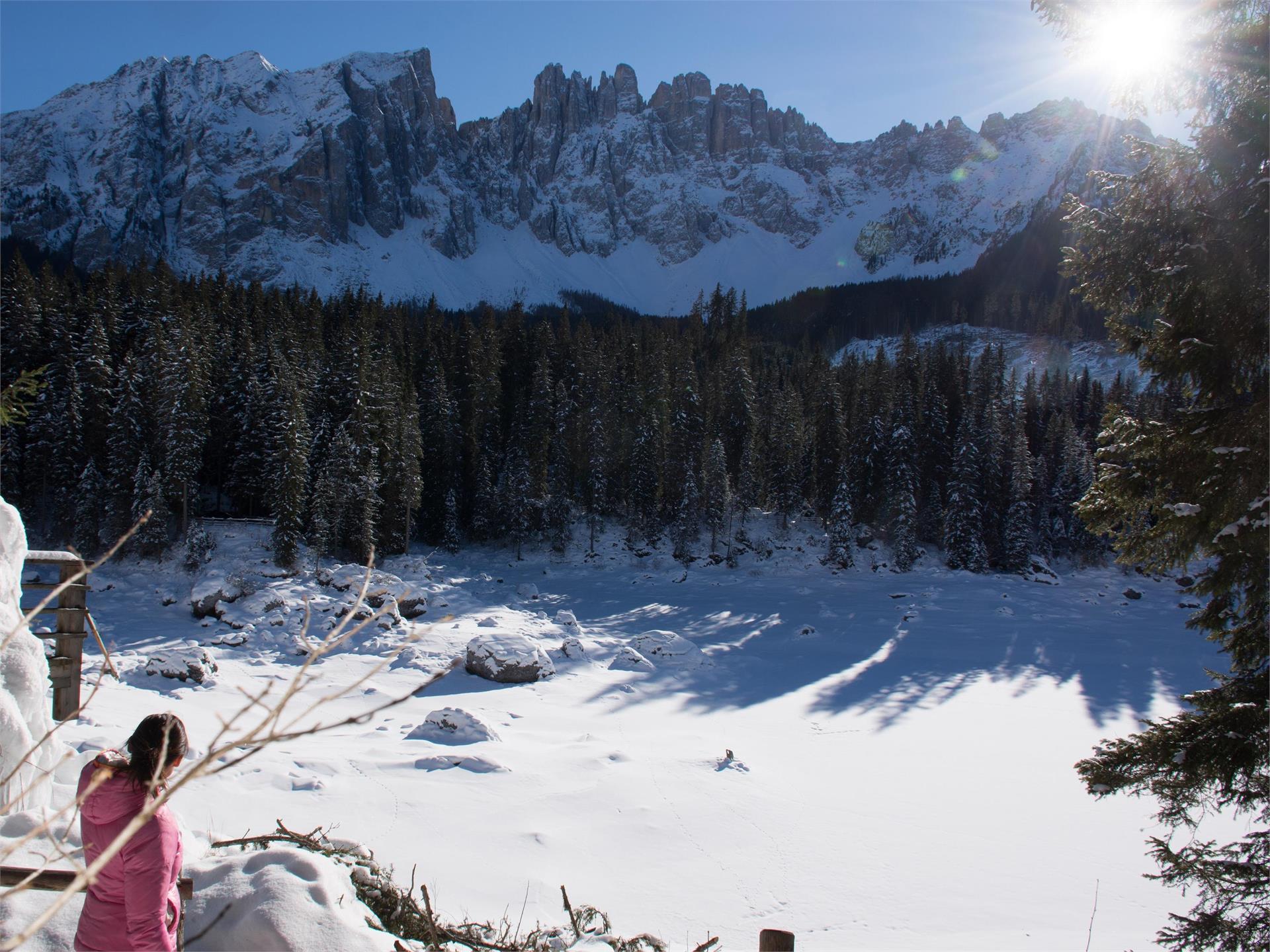 Einfache Rundwanderung für die ganze Familie zum sagenumwobenen Karer See im Winterkleid.
