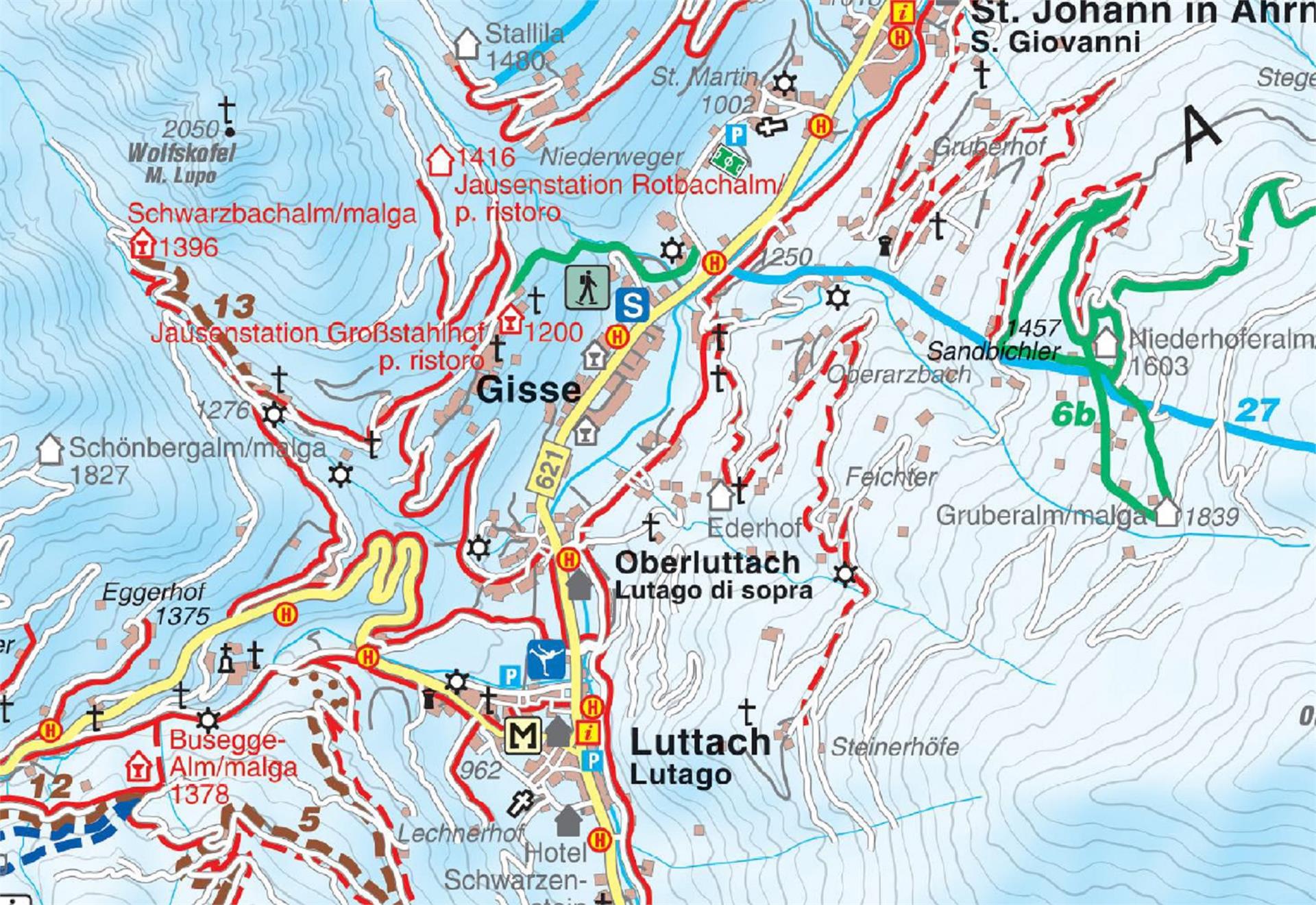 Tour: Luttach Tourismusbüro – taleinwärts entlang der Straße bis zum Hotel Post – Bergstraße Richtung Brunnberg – Jausenstation Großstahlhof