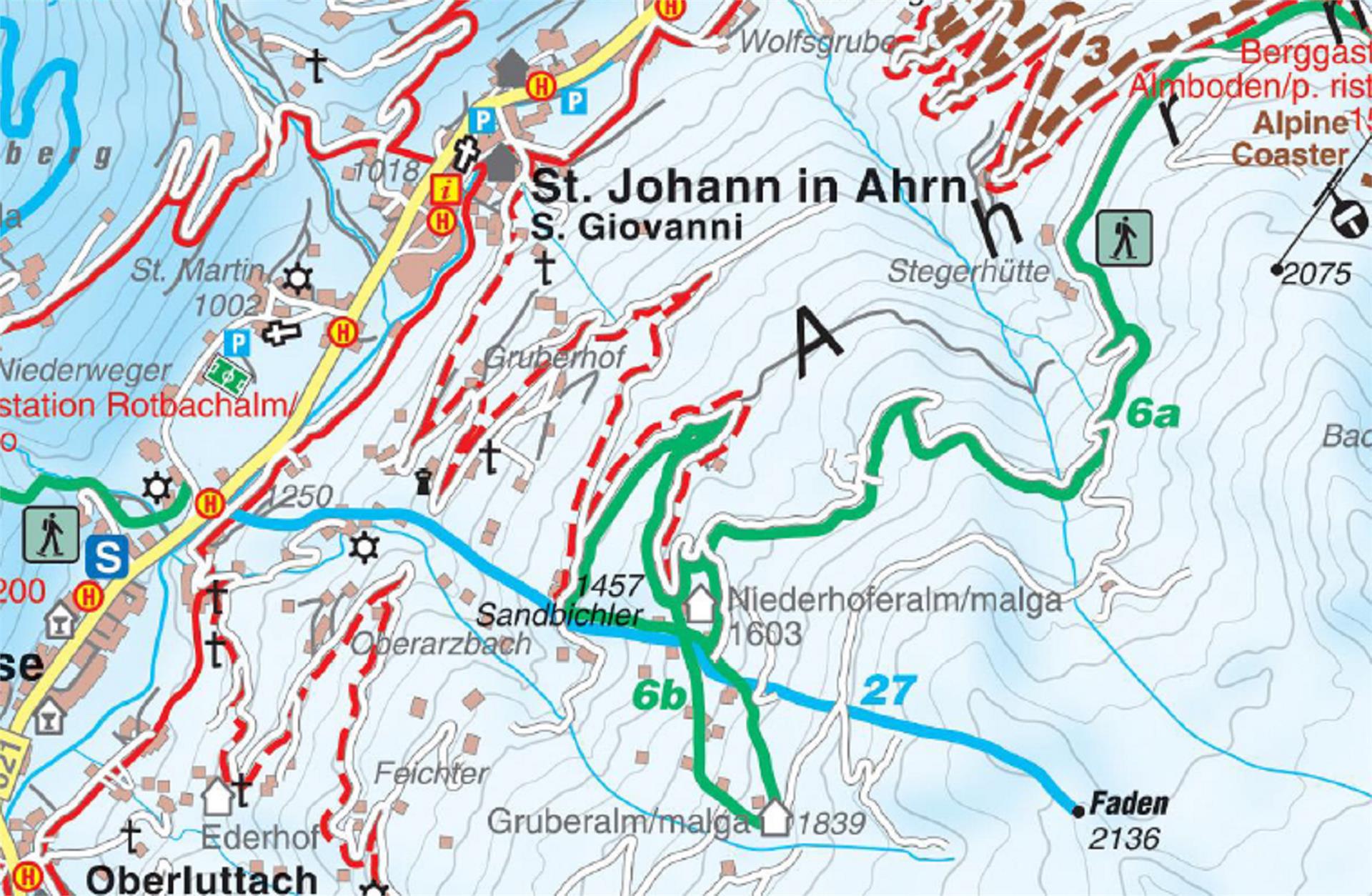 Tour:St. Johann Tourismusbüro – taleinwärts vorbei an der Kirche bis zum Hotel Schachen – rechts über die Brücke – Straße vorbei an der Festhalle in Richtung Gruberhof – bis zum Sandbichler Hof