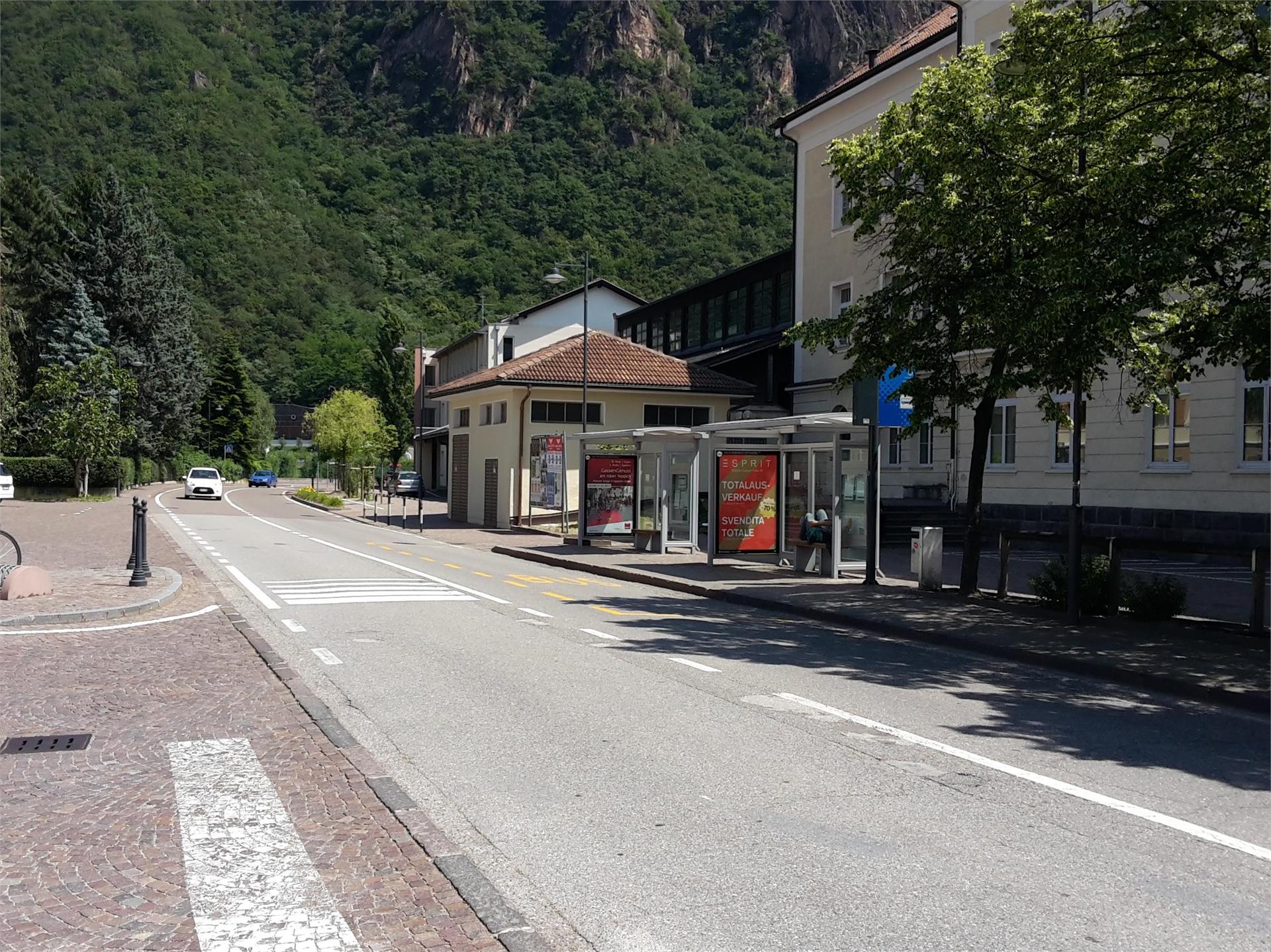 Die Bushaltestelle befindet sich im Zentrum von Terlan vor der Schule.