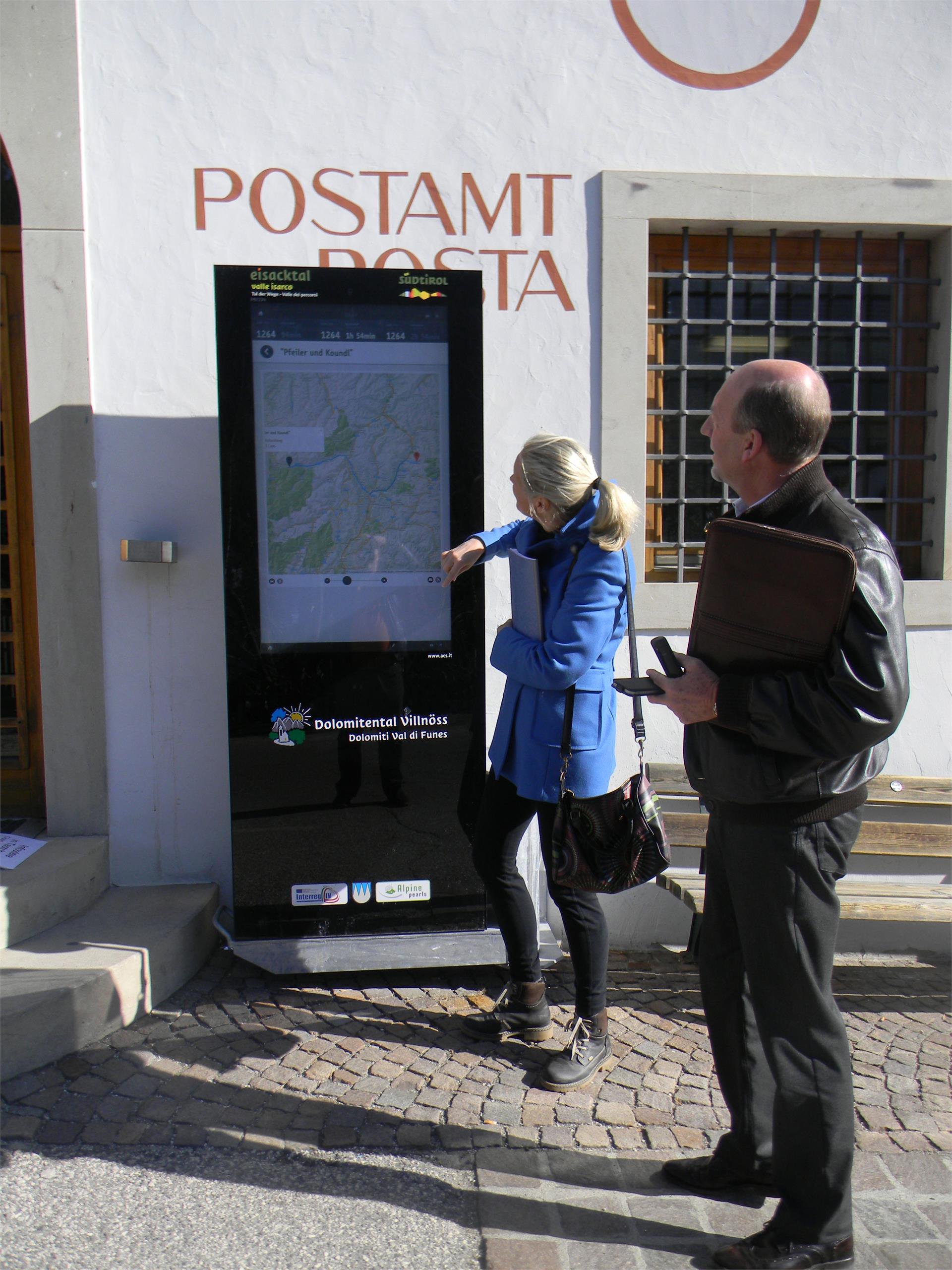 Interaktiver Infopoint im Zentrum von St. Peter. Der Infopoint lässt sich ganz einfach durch Berührung bedienen und liefert Ihnen Informationen zu Busverbindungen, Unterkünften, Restaurants, Wanderungen, Sehenswürdigkeiten und vielem mehr.