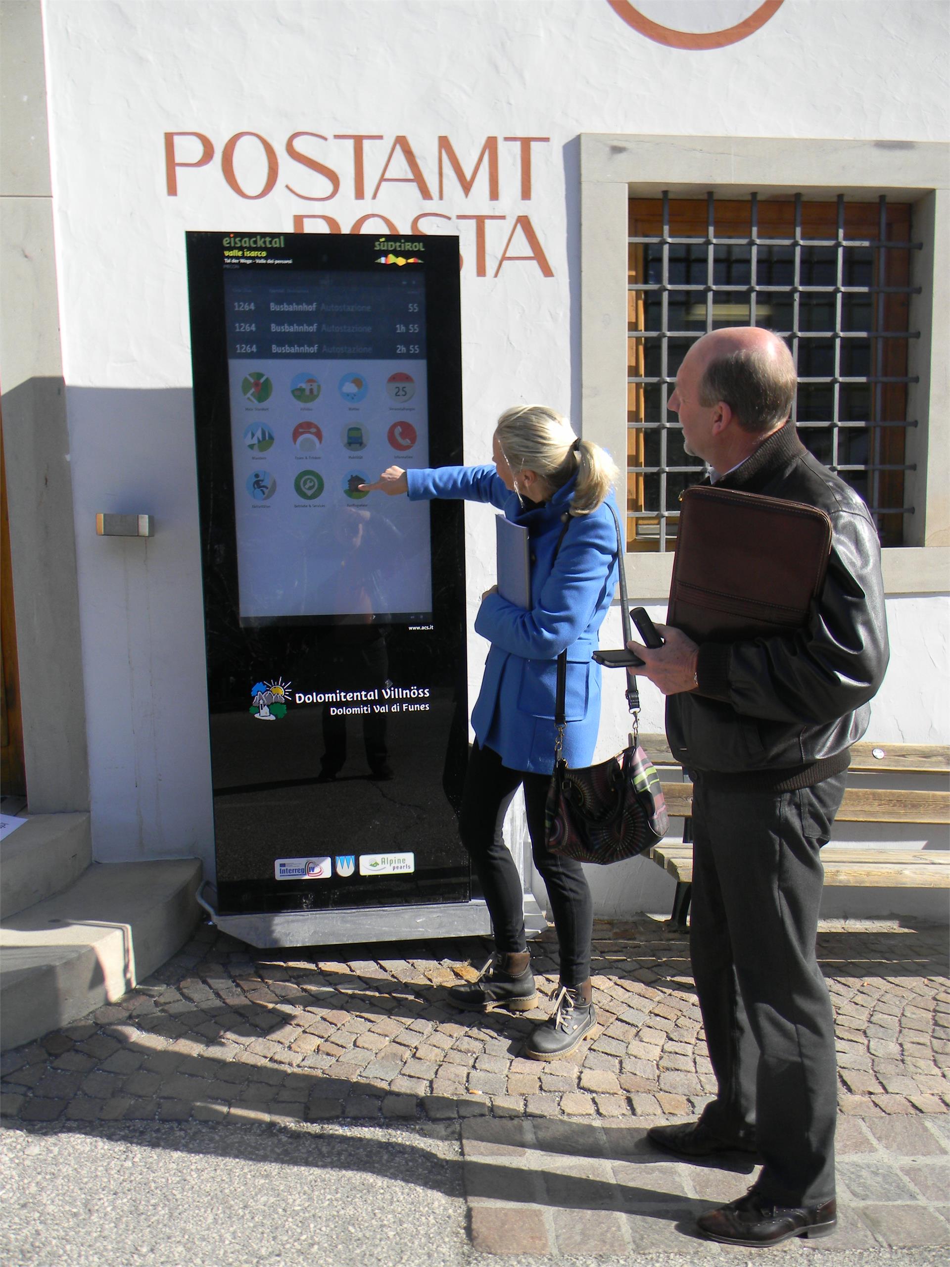 Interaktiver Infopoint am Parkplatz Zans. Der Infopoint lässt sich ganz einfach durch Berührung bedienen und liefert Ihnen Informationen zu Busverbindungen, Unterkünften, Restaurants, Wanderungen, Sehenswürdigkeiten und vielem mehr.