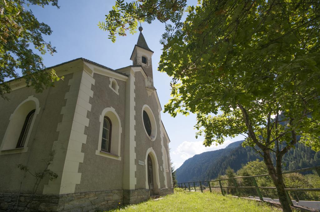 1882 erfolgte die Grundsteinlegung zur heutigen Kapelle. Nach Entwürfen von Baumeister Josef Vonstadl erbaut, wurde sie 1886 geweiht. Der neuromanische Bau besteht aus einem Haupt- und zwei Seitenschiffen sowie runder Apsis. Der erste Hochaltar stammt von F. Schmalzlaus aus St. Ulrich, doch schon 1889 hat die Kapelle anscheinend einen neuen Altar erhalten, den Bildhauer Stufflesser nach Zeichnungen von Johann Maria Reiter schuf.