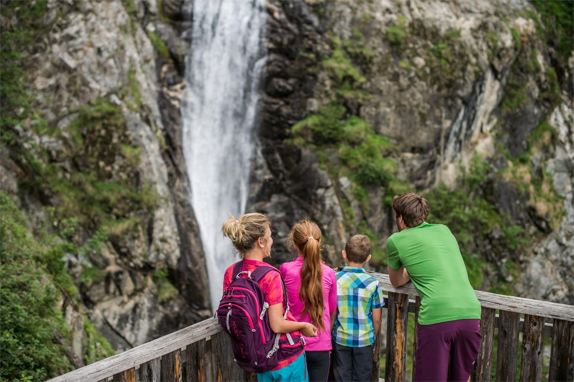 Der Klammbachwasserfall speist sich im Gletschergebiet der Rieserferner. Er durchkämmt das Gestein und tritt oberhalb von Antholz Mittertal heraus.