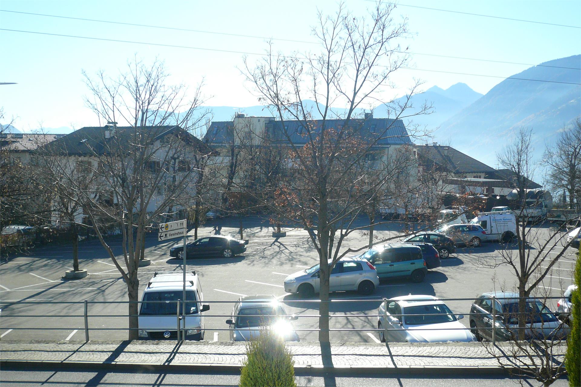 Car park subject to a charge beside the clubhouse in the center of Dorf Tirol/Tirolo – last parking opportunity for visitors of Tyrol Castle.