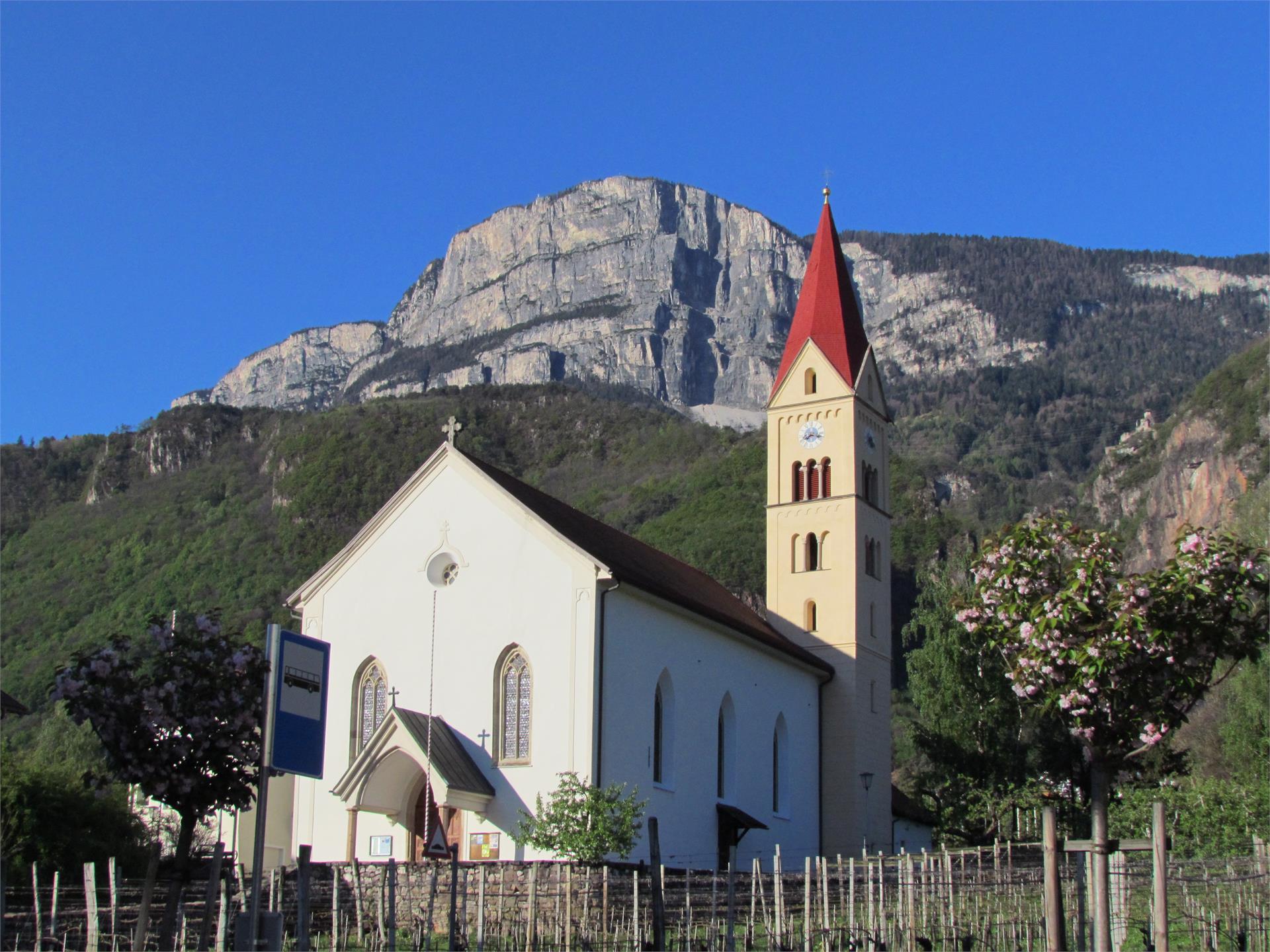 Andrian’s parish church is dedicated to Saint Valentine. The patrocinium of St. Valentine suggests that it was a place of worship here very early on. The first documented mention of a church dates back to 1231. The oldest part of the present church consists of the lower part of the tower with the three-part ogival spire windows. Unfortunately, the nave of that time has not been preserved, but it is part of the building erected in the early 16th century, which today forms the choir of the church and has preserved its late Gothic elements with its ogival windows and star-ribbed vaulting. Some frescoes from that period can still be seen in the present-day sacristy, as well as the statues of Mary with Christ Child, St. Sebastian, St. Anne, St. Barbara and St. Catherine (late 15th/early 16th century) in the neo-Gothic winged altar, which was only made in 1904. All the rest of the church, including the nave and the upper part of the tower, was not built until the 19th century (nave 1852-1854, tower 1883) and in 1864 the side altarpieces were painted by Anton Psenner.