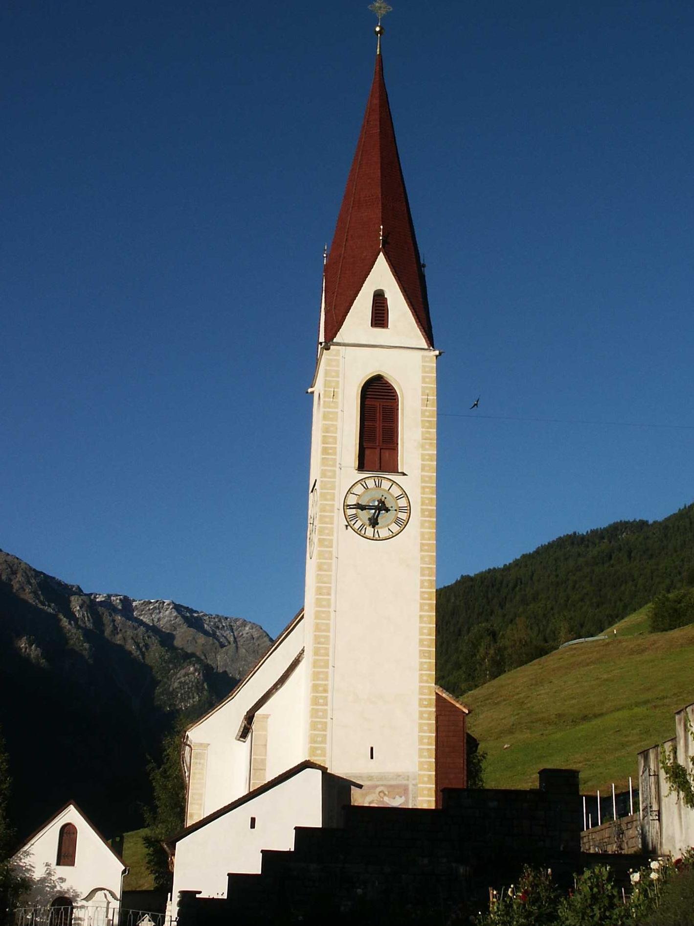The original parish church of St. Walburga is thought to have already been in existence around 1203, and is located close to the permanent settlements by the stone river surfaces in Val Martello. The church was consecrated in 1440, it was extended in 1650, and an upper section was added in 1759. The neo-romanesque altar was completed in 1887.