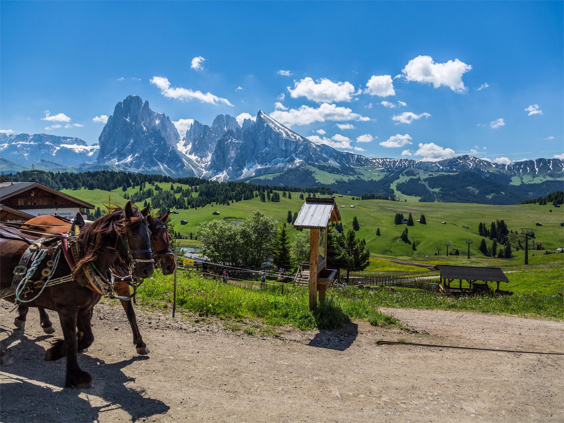 Take a horse and carriage ride over Europe’s largest high mountain plateau and enjoy the unique scenery of the Dolomite peaks, the Langkofel, Plattkofel and the Schlern massif in comfort: the set-off point for your tour is the Information Office on the Seiser Alm. The horse and carriage ride takes you over endless meadows, past the woods, the blossoming meadows and Alpine huts tempting you to drop in and partake of their hospitality.