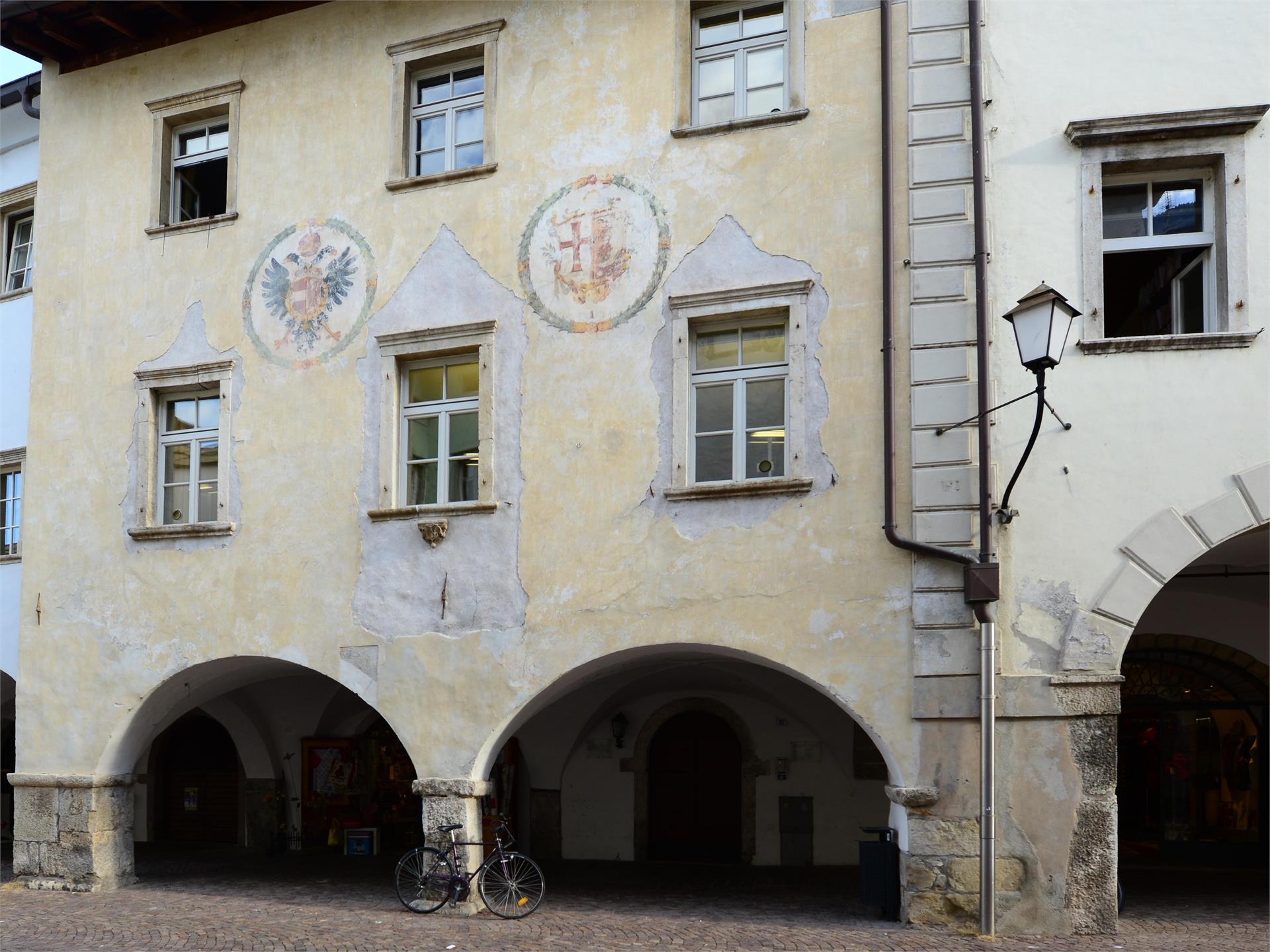 Seat of the district association in Egna. Farther down the street, you come to house number 22, today, the seat of the district association of Bassa Atesina. Here again we find Peter Gand’s coat of arms and the date of construction, 1583, on the portal. The building distin...