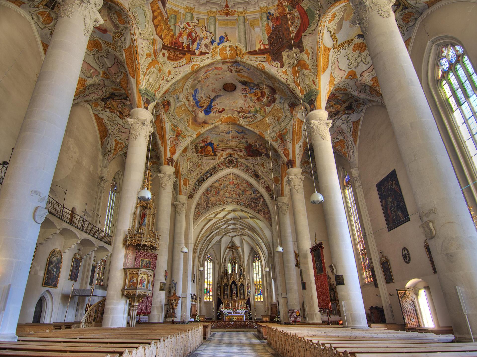 Spätgotischer Bau, Chor 1417-1451, Langhaus 1497-1524. Bedeutend sind die fünf Multscherfiguren am Hauptaltar und viele andere Kunstwerke. Postumia Viktorina Stein: Römischer Grabstein, 1497 bei Grundaushebungen für die Fundamente der Pfarrkirche gefunden. Er ist heute im Inneren der Kirche an der Nordseite angebracht.