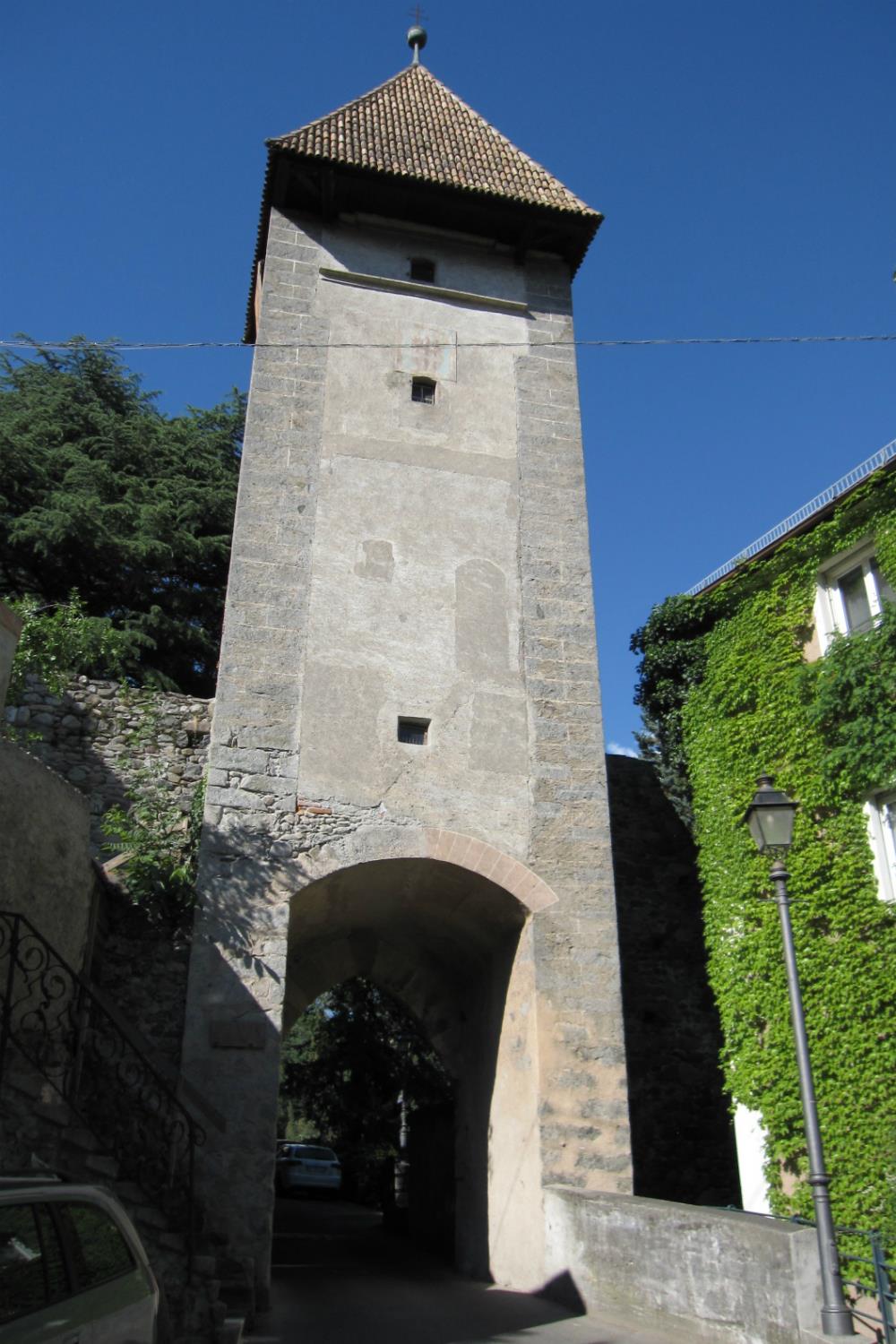 Three of the original four town gates still exist. The gates took the name oft the valleys or the towns fhey faced: Val Venosta, Bolzano, Val Passiria and Val d’Ultimo. The Ultimo Gate was situated in what is today piazza Teatro. On both sides of the Passiria Gate it is st...