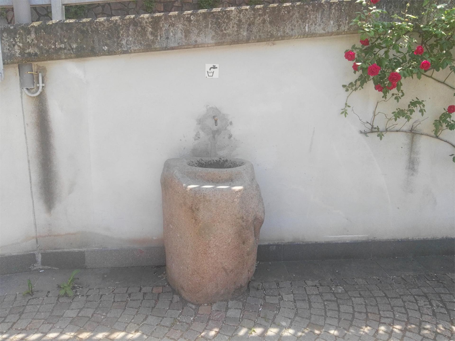 Dieser Steinbrunnen mit trinkbarem Wasser befindet sich am Platz vor dem Haus der Dorfgemeinschaft im Dorfkern von Karneid.